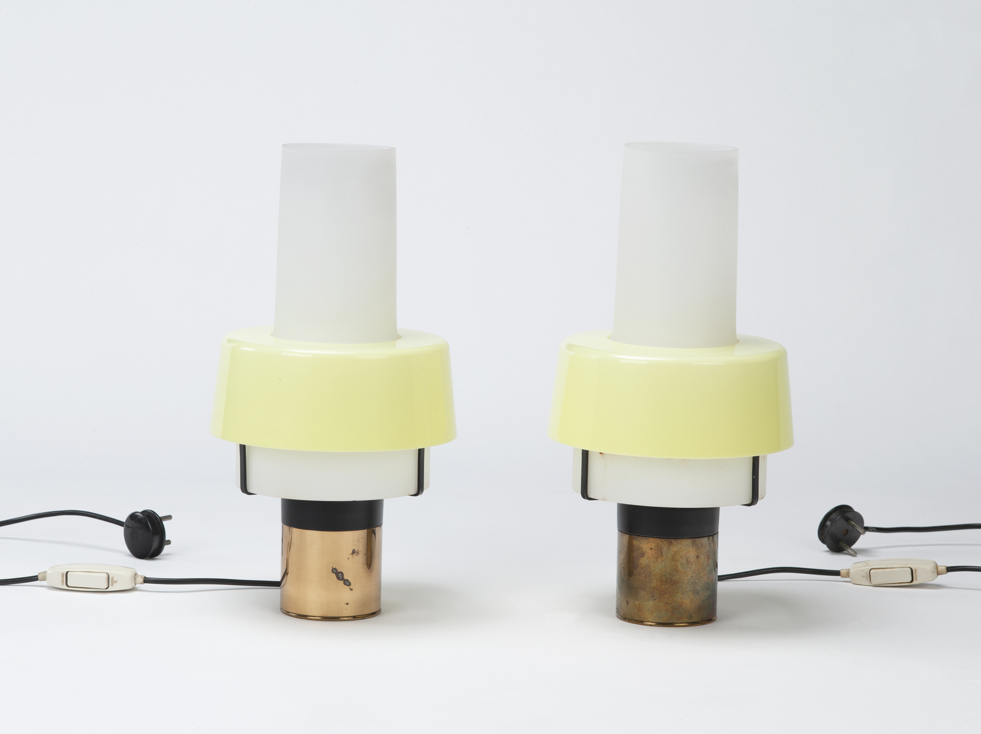 Stilnovo Coppia lampade da tavolo, Anni ’60;In ottone, vetro opalino e plastica, h. 33 cm,