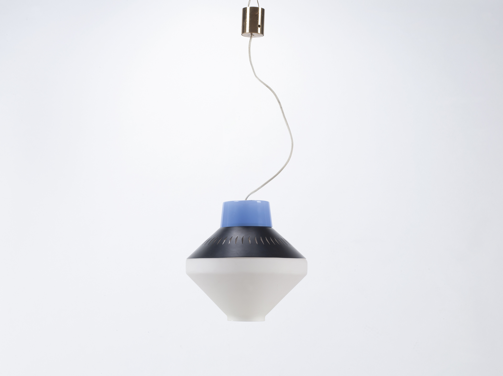 Stilnovo Lampada a sospensione, Anni ’60;In vetro satinato, metallo, ottone e plastica,