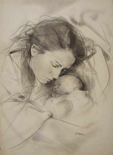 Presotto Alfio " Scena materna " carboncino su carta cm 50 x 70, firmato in basso a destra,Prov.COLLEZIONE PRIVATA