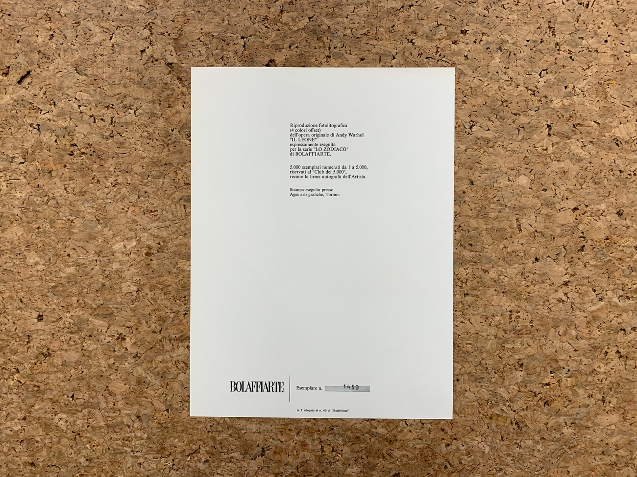 Indicazioni dell'edizione e numerazione (Esemplare 1459 su una tiratura di 5000 copie) al retro