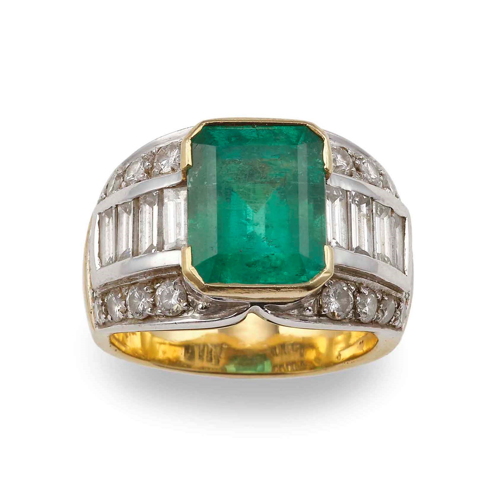 montatura in oro giallo ed oro bianco 750/1000, olio e resina all'interno dello smeraldo, gr. 18,8, misura italiana 19.5
