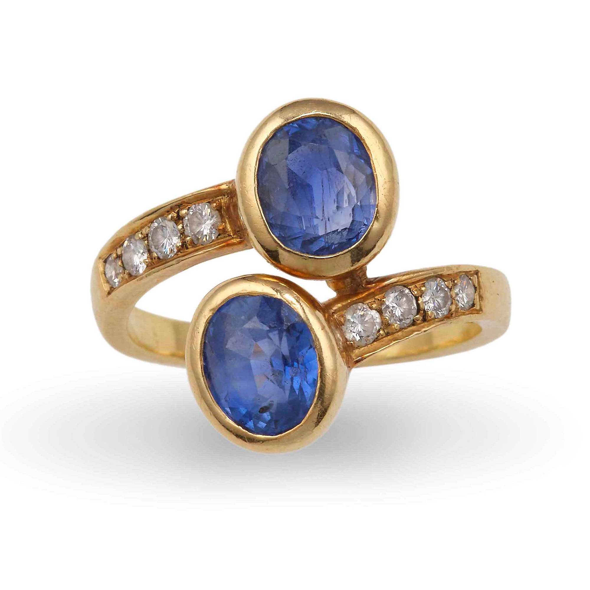 Anello contrarié con due zaffiri probabile Sri Lanka per ct 1.60 circa e piccoli diamanti