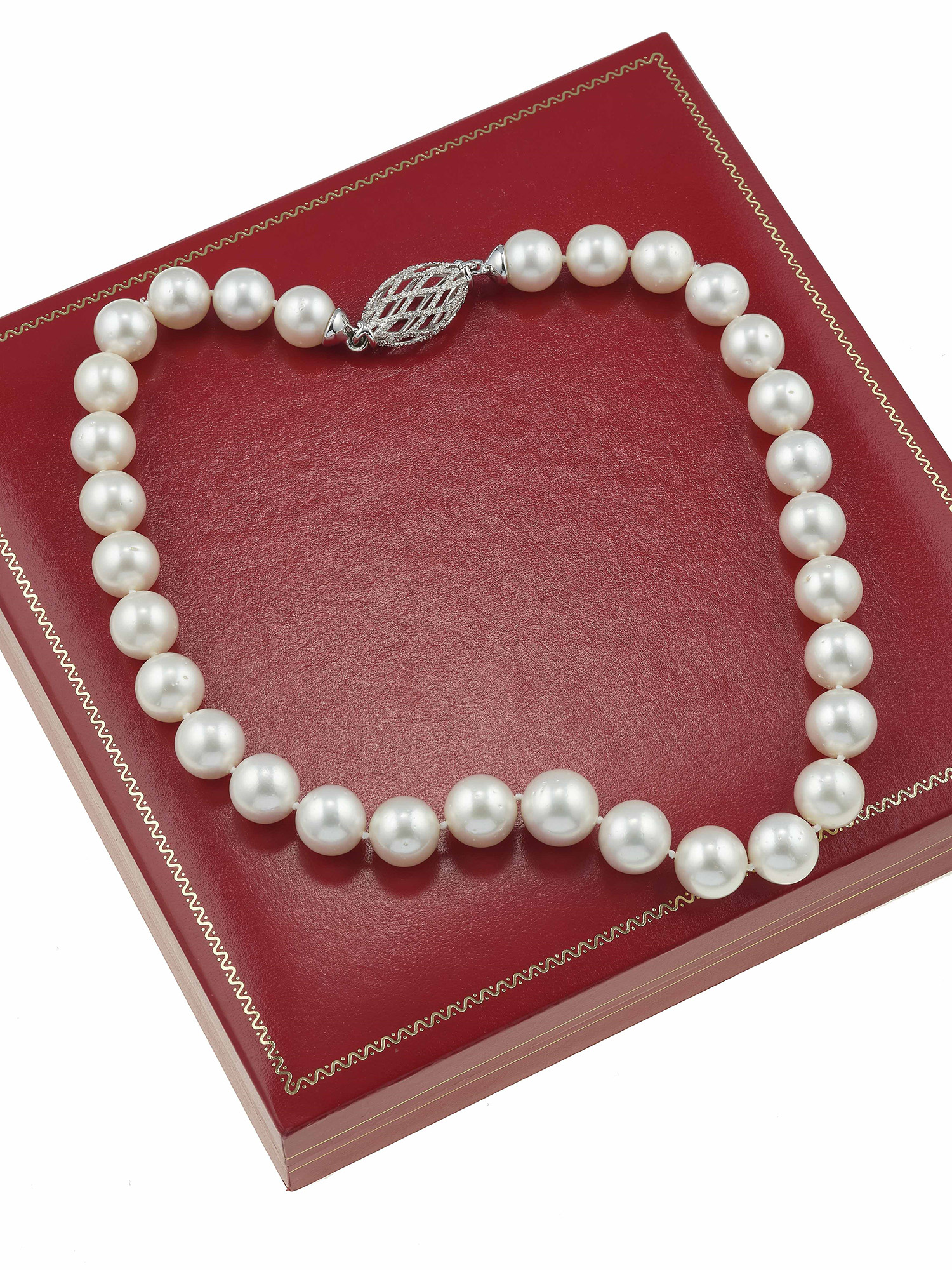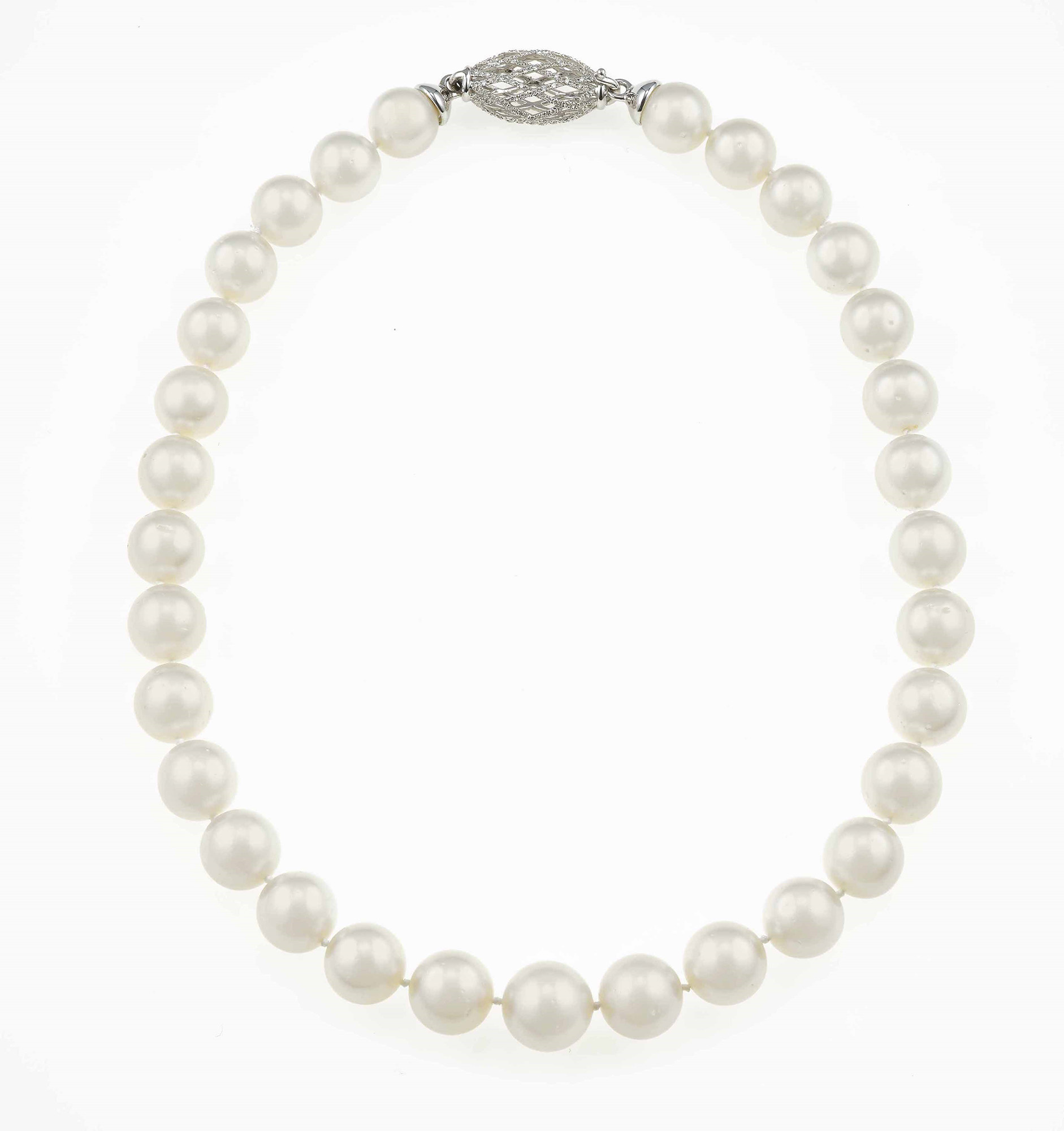 fermezza in oro bianco 750/1000 con piccoli diamanti, gr. 123,4, cm 51, perle mm 13,10 - 13,77 - 15,35