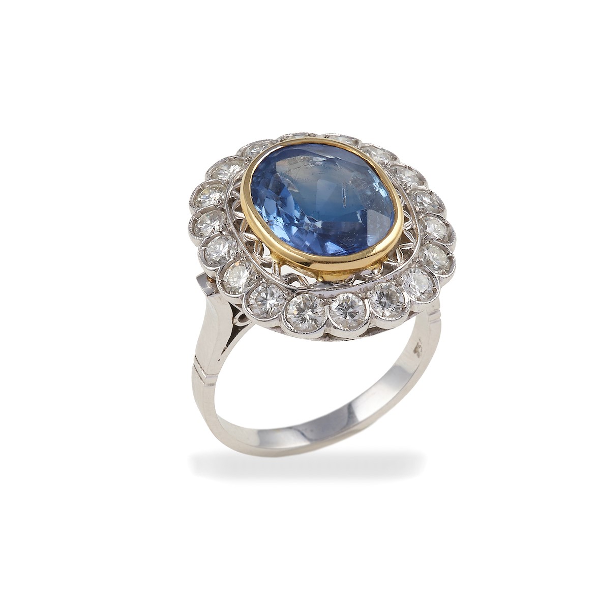 montatura in oro bianco ed oro giallo 750/1000, gr 9.7, misura italiana 19, probabile zaffiro non scaldato