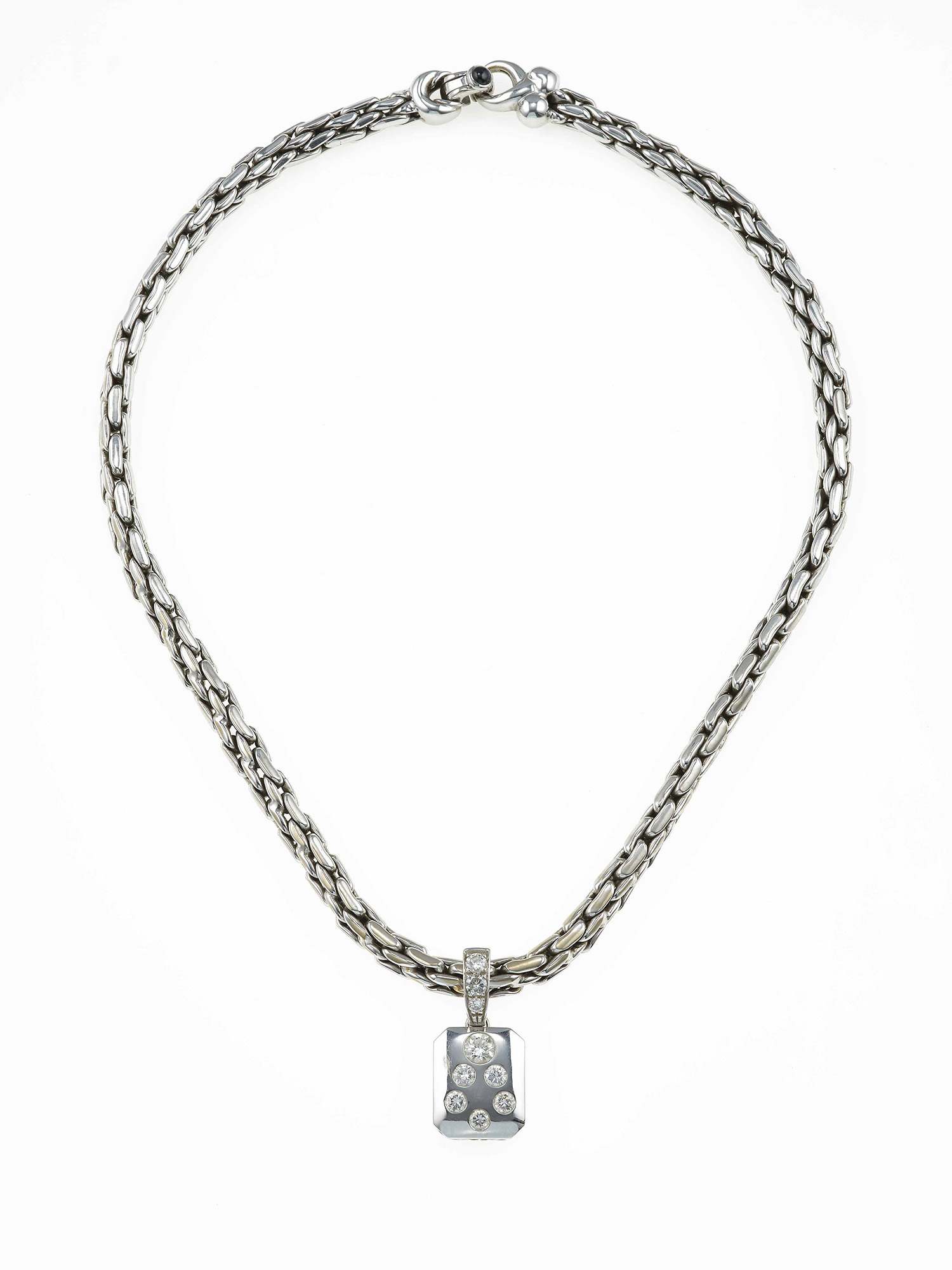 montatura in oro bianco 750/1000, gr 52.2, catena cm 45.7, pendente cm 3.3 x 1.7