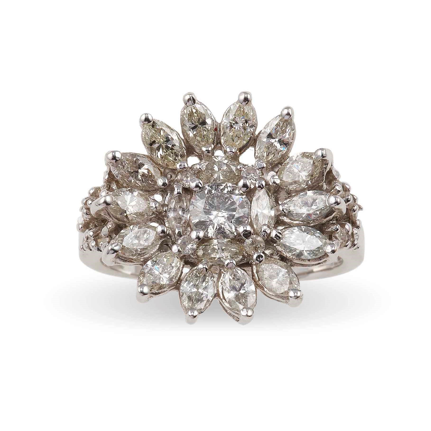 montatura in oro bianco 750/1000, gr 7.4, misura italiana 20, diamanti taglio brillante e navette, per ct 2,00 circa, caratteristiche interne SI/P, colori misti