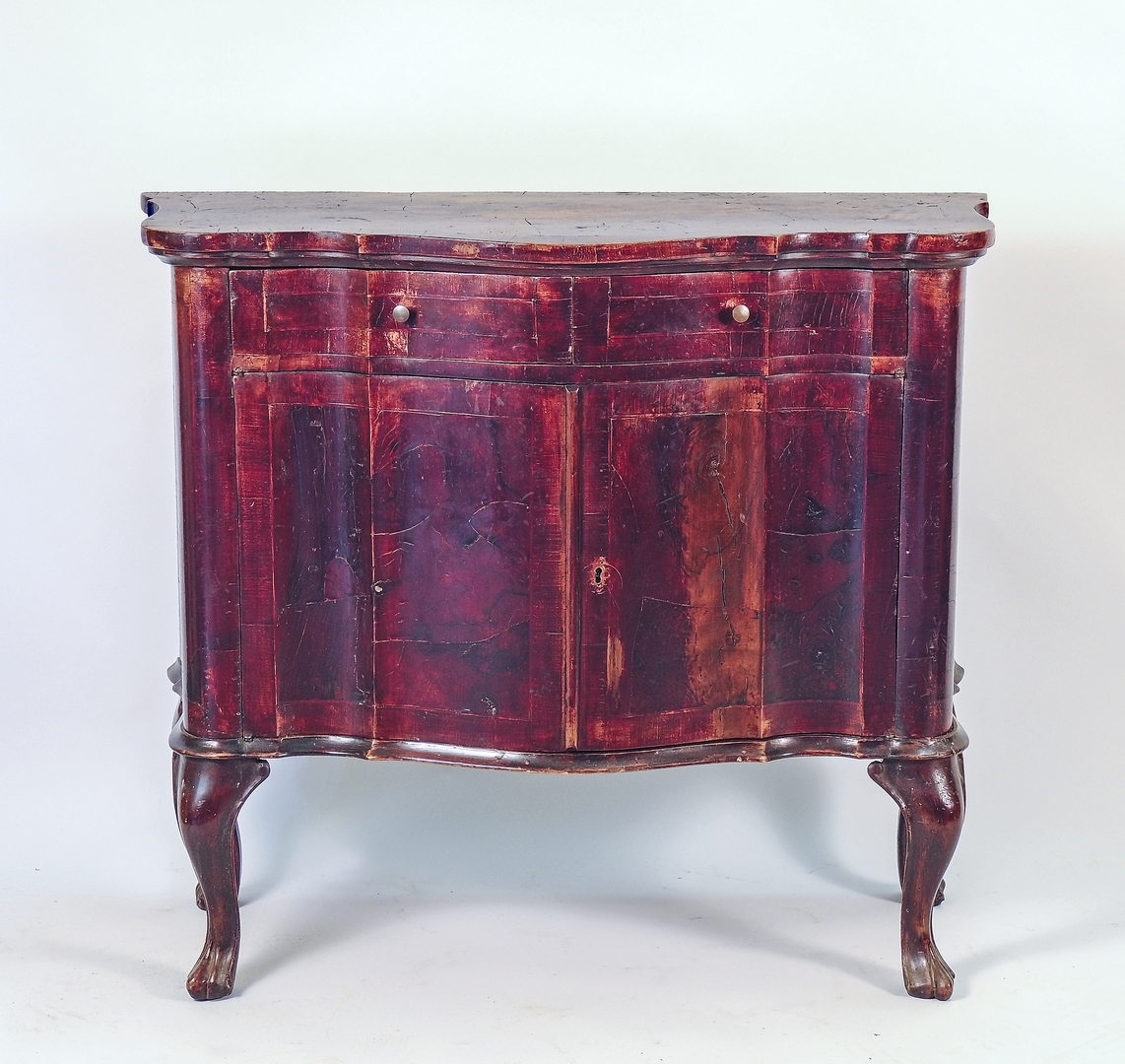 MOBILE BAR IN NOCE piano sagomato, due cassetti sottostanti, fronte a due sportelli, gambe mosse h cm 87x99x43