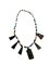 Collana ad un filo con vaghi in pasta vitrea colorata con sette pendenti trapezoidali in bronzo fuso, cesellato, decorati a sferette in rilievo