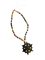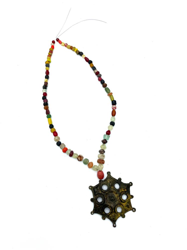 Collana ad un filo con vaghi in pasta vitrea colorata con grande pendente a stella stilizzata in bronzo fuso, cesellato e traforato