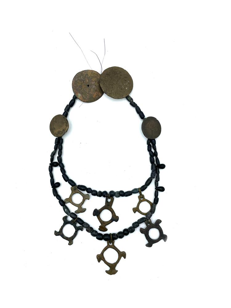 Pettorale a due fili con vaghi tubulari in pasta vitrea nera con quattro grandi ornamenti circolari e sei corone di Odino, in bronzo fuso, cesellato e traforato