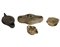 Lucerna bilicne con corpo allungato con due becchi opposti a canale aperto e disco a due fori di alimentazione decentrati; piccola ansa anulare impostata al centro del disco; lucerna africana con spalla distinta dal disco decorato da cornice di cerchi e cuori; disco tendente all'ovale con due fori di alimentazione e figura maschile frontale stante con mani ai fianchi e corta tunica (Vulcano con martello e tenaglie?); ansa piena sporgente dal corpo; lucerna a prese laterali con spalla piatta e stretta; disco concavo delimitato da una scanalatura e decorato da un tritone(?) e due delfini ai lati di un'ara; due prese ムムa fioccoヤ sui lati; piccola lucerna di ムムforma apertaヤ con coperchio (4)