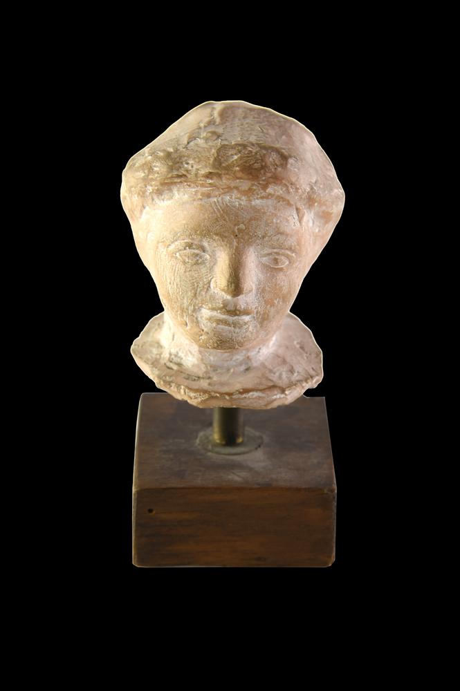 Testina maschile giovanile, probabilmente parte di una statuetta votiva, con capelli modellati sommariamente a calotta, fronte bassa, occhi amigdaloidi, naso piccolo e bocca dalle grandi labbra socchiuse.
