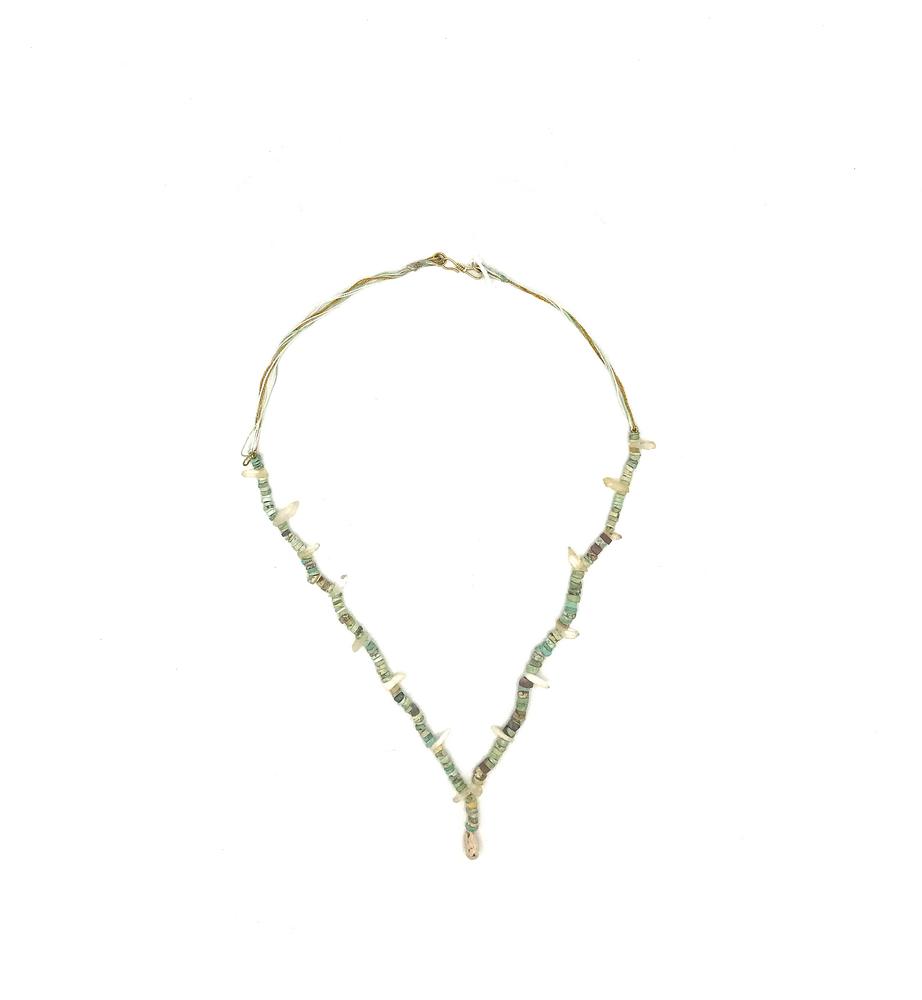 verde, bianca e azzurra con vaghi circolari ed elementi prismatici in calcare e cristallo di rocca,e pendente in calcare bianco, formata da elementi antichi. Lung cm 34
