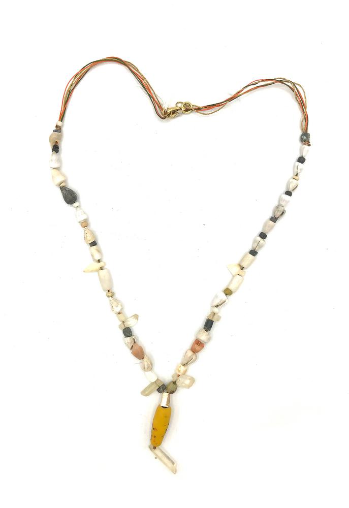 in conchiglie e pietre dure, con vaghi cilindrici, sferici e prismatici, formata con elementi antichi, lung cm 44