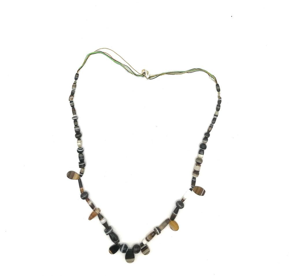 in agata fasciata con vaghi fusiformi, sferici e cilindrici ed elementi a foglia, formata da elementi antichi, lung cm 58