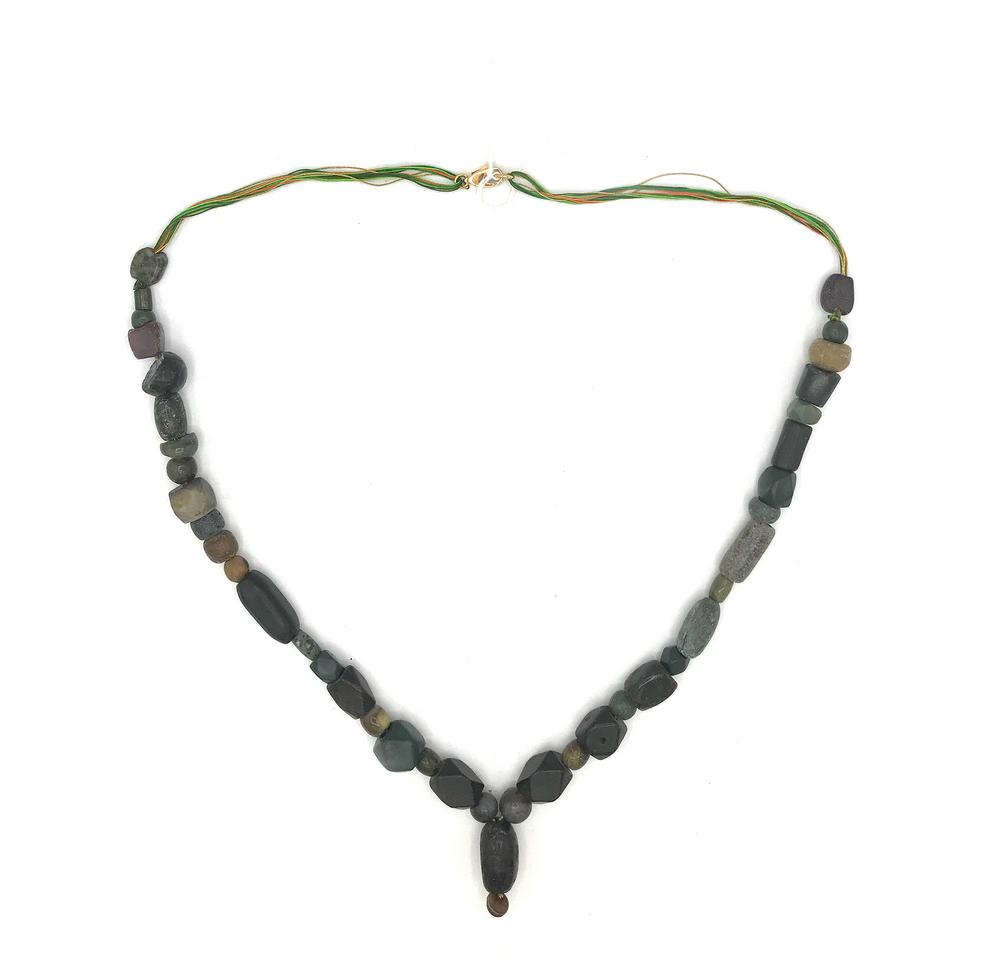 in pietre dure colorate e agata, con vaghi cilindrici, sferici e prismatici, formata da elementi antichi, lung cm 52