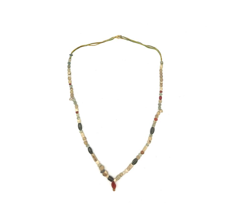 in calcare bianco, corniola, vetro e conchiglie, con vaghi cilindrici, sferici e prismatici, formata da elementi antichi, lung cm 52