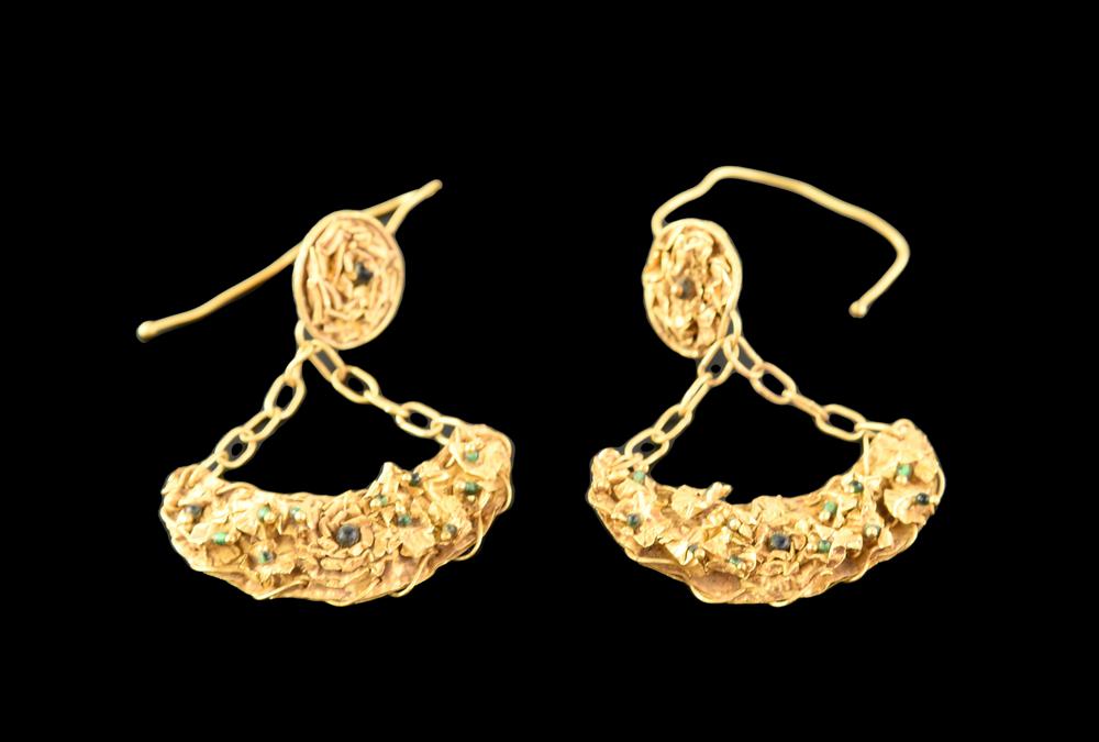 Coppia di orecchini con ganci in filo d'oro, collegati con un elemento ovale decorato da un fiore stilizzato e tramite due catenelle ad un elemento semilunato con fiori stilizzati in rilievo, decorati con paste vitree colorate.