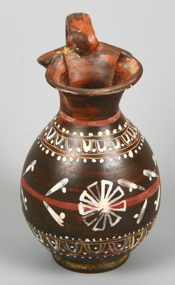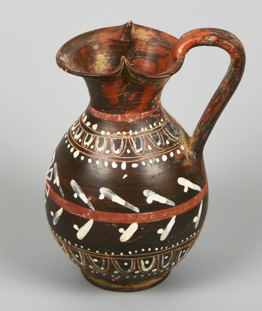MATERIA E TECNICA: argilla figulina rosata, vernice bruna lucente, suddipinture in bianco e paonazzo; modellata a tornio veloce