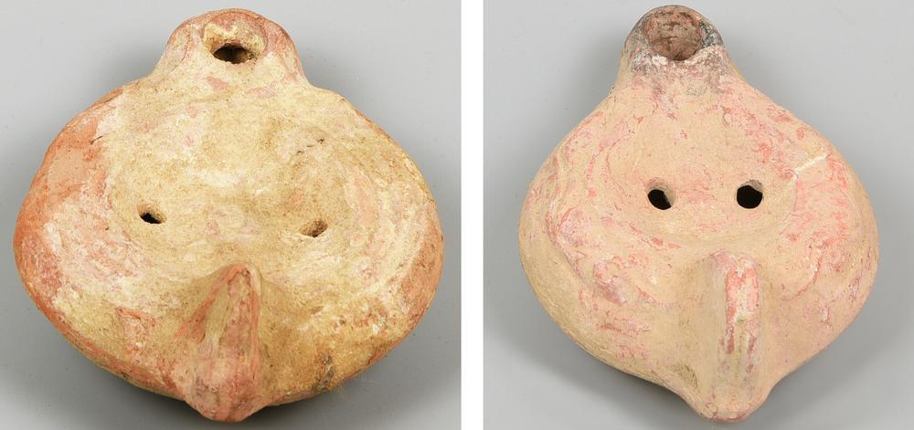 Due lucerne monolicni delle quali una con becco a volute, terminante ad angolo ottuso, ansa sopraelevata plastica a presa, disco decorato con busto maschile paludato, l'altra con bordo a volute vegetali (2)