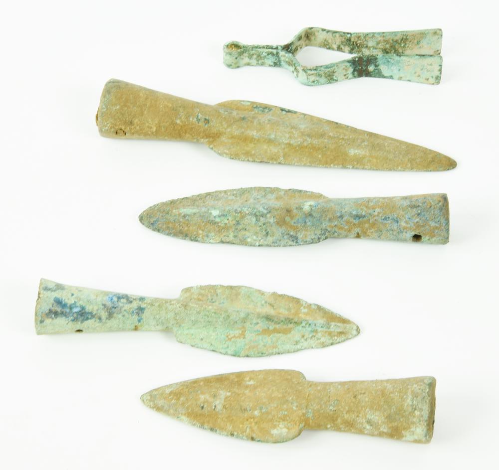 Quattro punte di lancia in bronzo, con immanicatura a cannone e lama foliata e costolata ed un paio di pinzette in lamina di bronzo, con anello di sospensione alla sommit¢