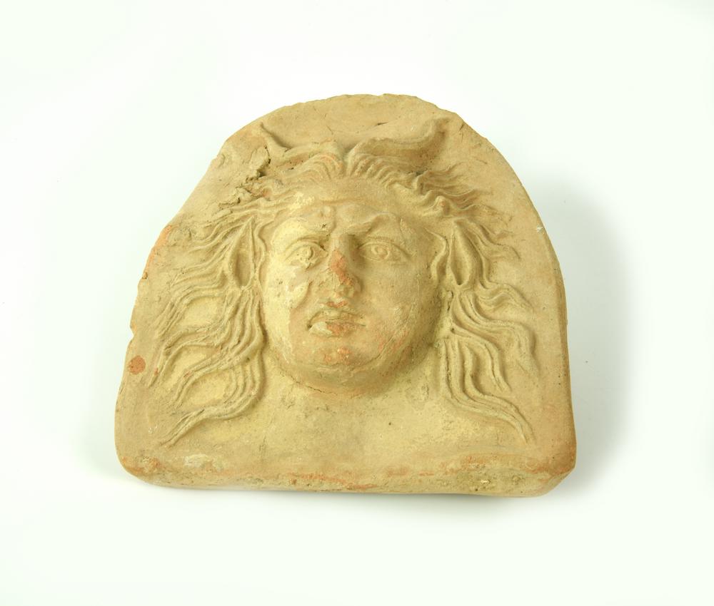Antefissa ad arco con busto di Pan, ben individuabile dalle corna e dagli orecchi appuntiti con folti capelli scomposti che ricadono sul collo; il volto è accuratamente delineato con grandi occhi con indicazioni di sopracciglia, palpebre e pupilla, zigomi ben rilevati, naso largo e bocca semiaperta
