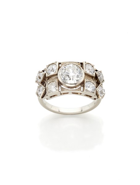 Anello in platino con diamanti old mine, diamante centrale di ct. 1,60 circa, per complessivi ct. 2,80 circa, g 6,57 circa misura 15/55.