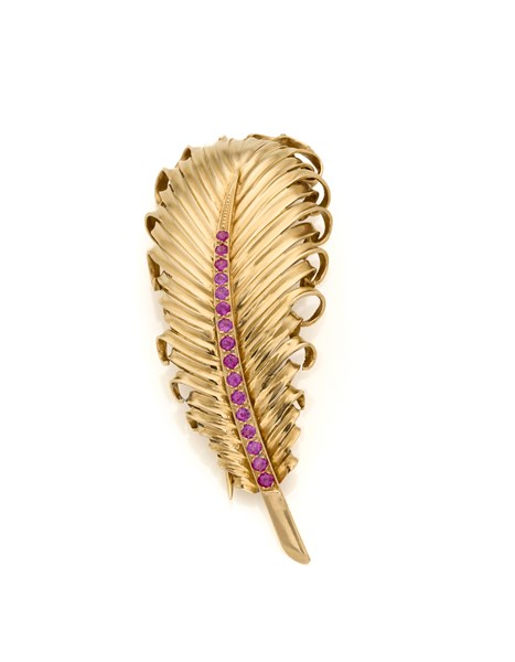 Lot 456 | BOUCHERON Broche in oro giallo a guisa di piuma rifinita con rubini, g 20,52 ci