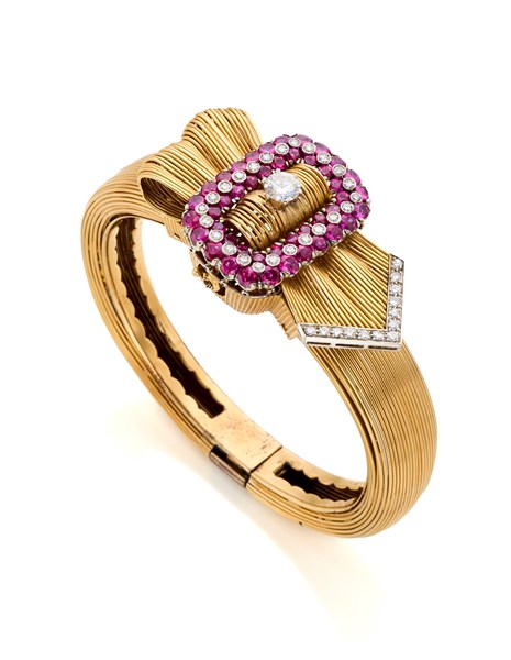 Bracciale rigido apribile in oro giallo con fibbia rifinita in diamanti e rubin