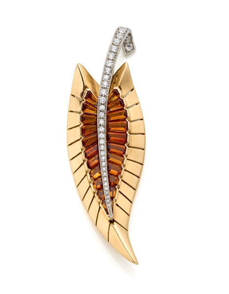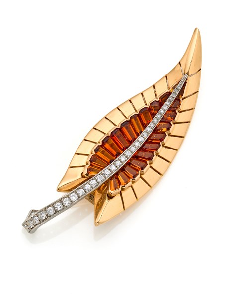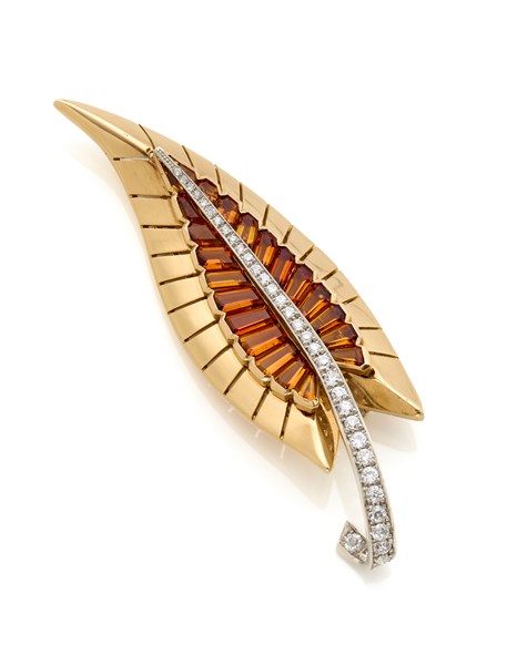 Broche in oro giallo e platino, diamanti tondi e quarzi citrini calibré, g 26,44 circa, lungh. cm 7,70 circa. Reca firma Cartier Paris, numerata 2743. In scatola Cartier