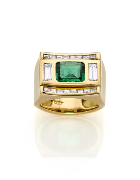 Anello in oro giallo con smeraldo ottagonale di ct. 1,20 circa e diamanti a baguette per complessivi ct. 0,85 circa, g 17,74 circa misura 15/55. Marcato 778 FI.