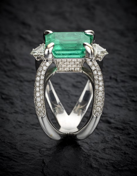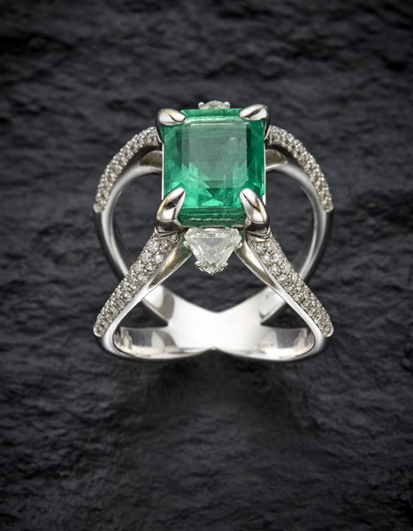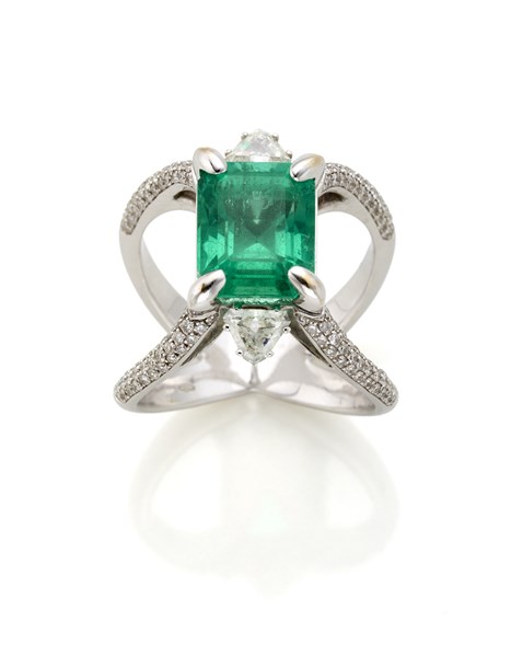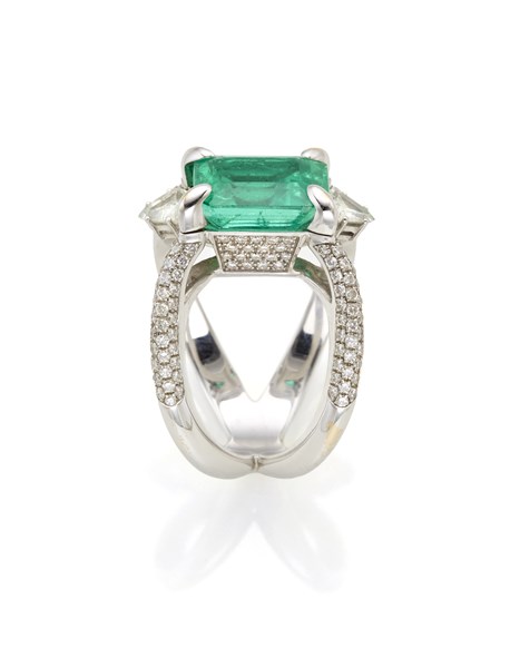 Anello "Galaxy" in oro bianco e diamanti tondi e triangolari per complessivi ct. 1,34 circa con smeraldo ottagonale di ct. 4,82 circa, g 12,95 circa misura 17/57. Marcato 2297 MI. Con Garanzia originale