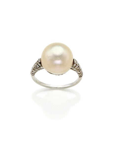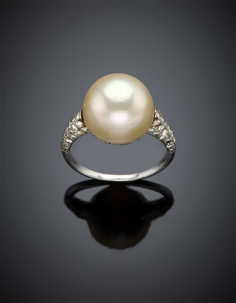 Button shaped natural saltwater pearl and diamond platinum ring, mm 12.40 circa pearl, g 5.90 circa size 13.5/53.5.