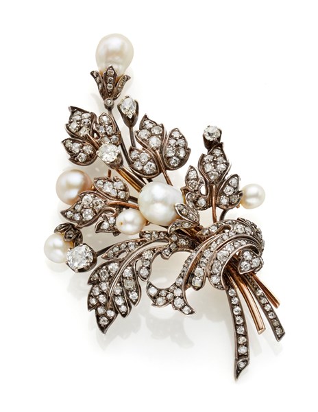 Broche floreale in oro e argento, diamanti old mine per complessivi ct. 3,20 circa e perle, g 26,23 circa, lungh. cm 7,80 circa.