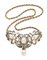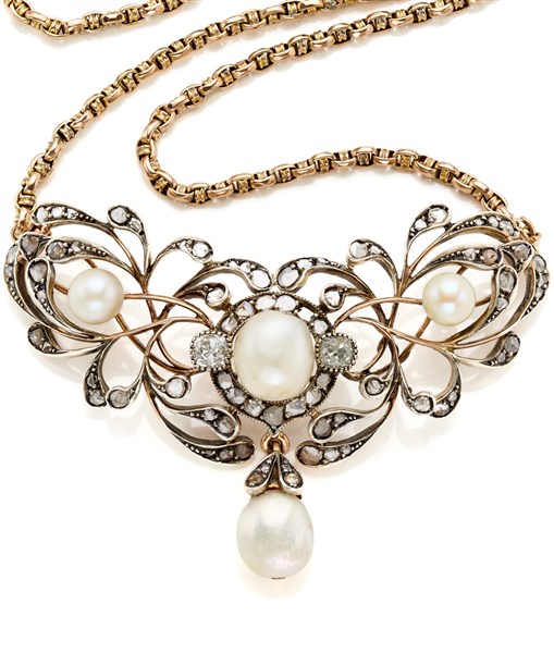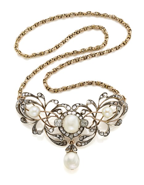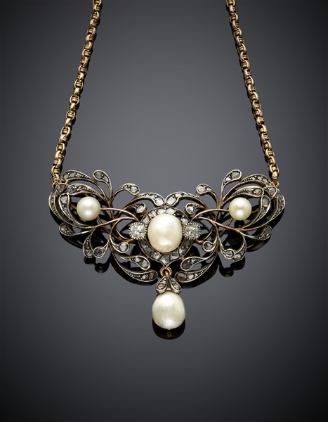 Centrale floreale in oro, argento, diamanti old mine per complessivi ct. 1,05 circa e a mezza rosetta rifinito con perle naturali d'acqua salata di mm 11/12 circa e perle, la catena in oro giallo 333/1000 di cm 41 circa, g 35,22 circa, lungh. cm 7,70 circa.
