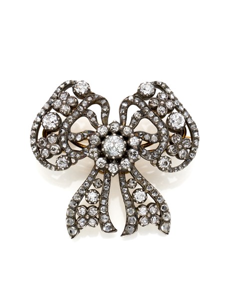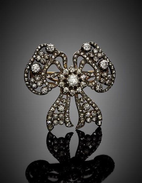 Lot 485 | CARTIER Spilla a fiocco in oro e argento, diamanti old mine e a mezza rosetta,