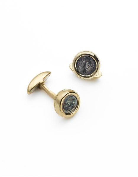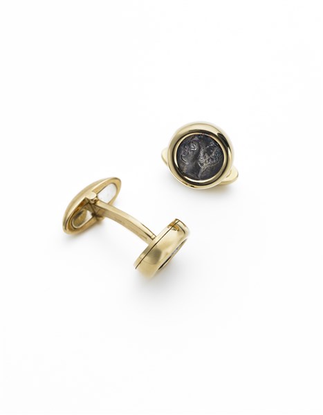 Silver "Gallia Massalia 385 - 220 b.C." coin yellow gold cufflinks, g 18.54 circa, diam. cm 1.30 circa. Signed and marked Bulgari, 269 TO, Made in Italy.