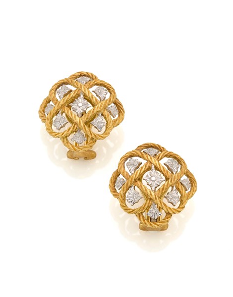 BUCCELLATI Orecchini in oro bianco e giallo cesellati, g 14,22 circa, lungh. c