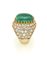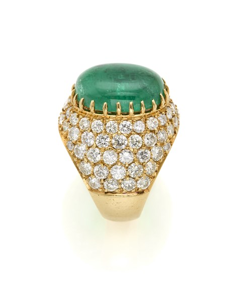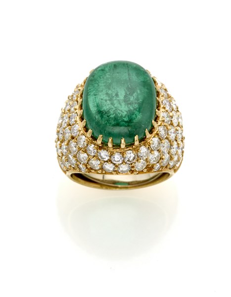 Anello in oro giallo con smeraldo cabochon di ct. 8,50 circa e diamanti a pavé per complessivi ct. 4,80 circa, g 13,09 circa misura 11/51.