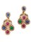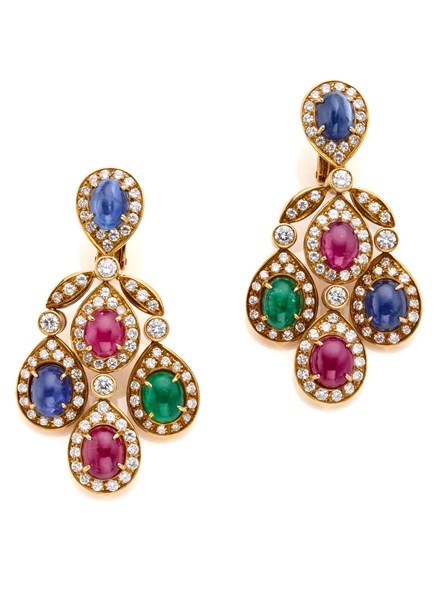 Orecchini pendenti in oro giallo e diamanti rotondi rifiniti con rubini e zaffiri cabochon per complessivi ct. 11,40 circa e per complessivi ct. 12,80 circa e smeraldi per complessivi ct. 3,80 circa, g 37,19 circa, lungh. cm 5,70 circa. Firmati Pederzani. In scatola originale