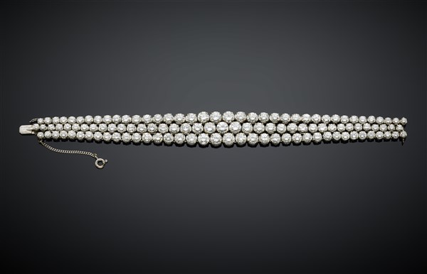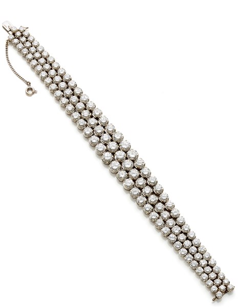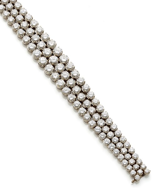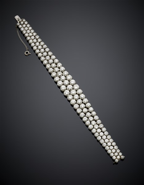 Bracciale in oro bianco a tre file di diamanti rotondi a scalare per complessivi ct. 30,00 circa, g 35,99 circa, lungh. cm 18 circa.
