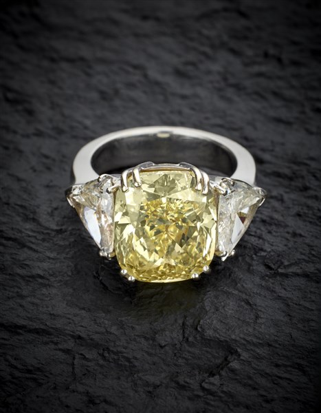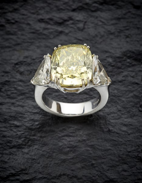 Anello in oro bianco con diamante a cuscino fancy intense yellow di ct. 8,73 e due diamanti triangolari laterali per complessivi ct. 2,80 circa, g 8,60 circa misura 9/49.