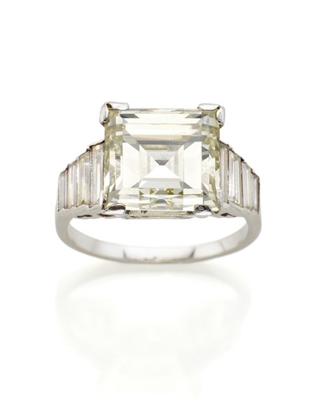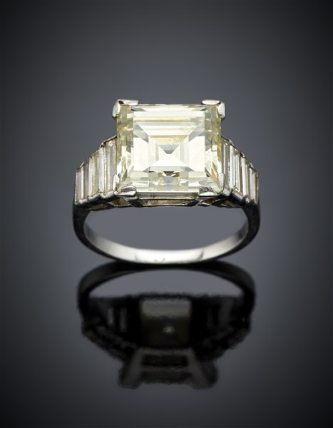 Anello in oro bianco con diamante carré di ct. 6,40 circa e rifinito con diamanti a baguette, per complessivi ct. 7,40 circa, g 6,85 circa misura 15/55.
