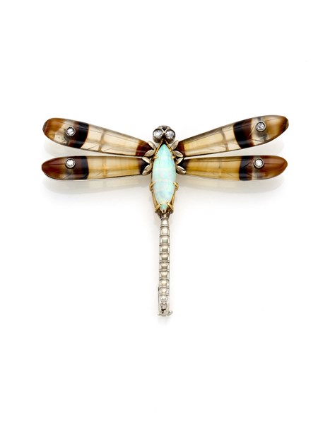 Spilla a guisa di libellula in oro giallo e bianco, agata e opale rifinita con diamanti a mezza rosetta, g 8,11 circa, largh. cm 5,20 circa.