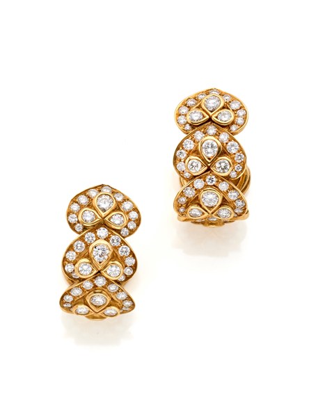 PEDERZANI Orecchini a cuori in oro giallo e diamanti, g 24,90 circa, lungh. cm