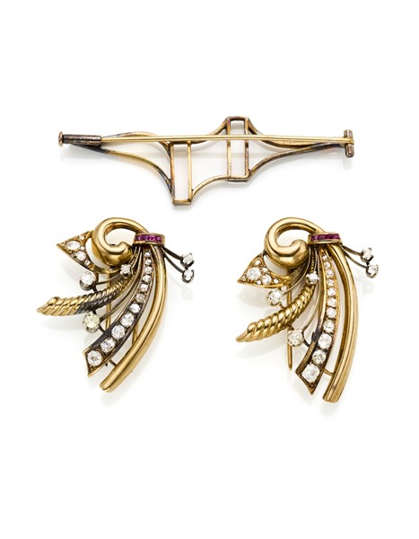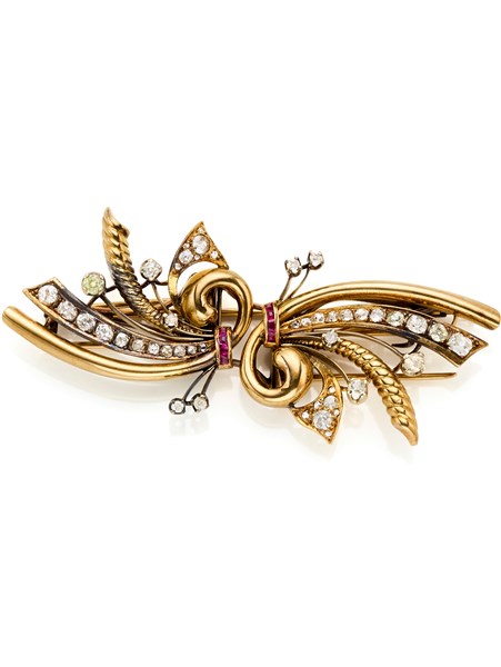 Doppia spilla a clip a volute in oro giallo, diamanti old mine per complessivi ct. 2,10 circa e rubini calibré con accessorio, complessivi g 37,42 circa, lungh. cm 8,70 circa. In scatola originale (lievi difetti)
