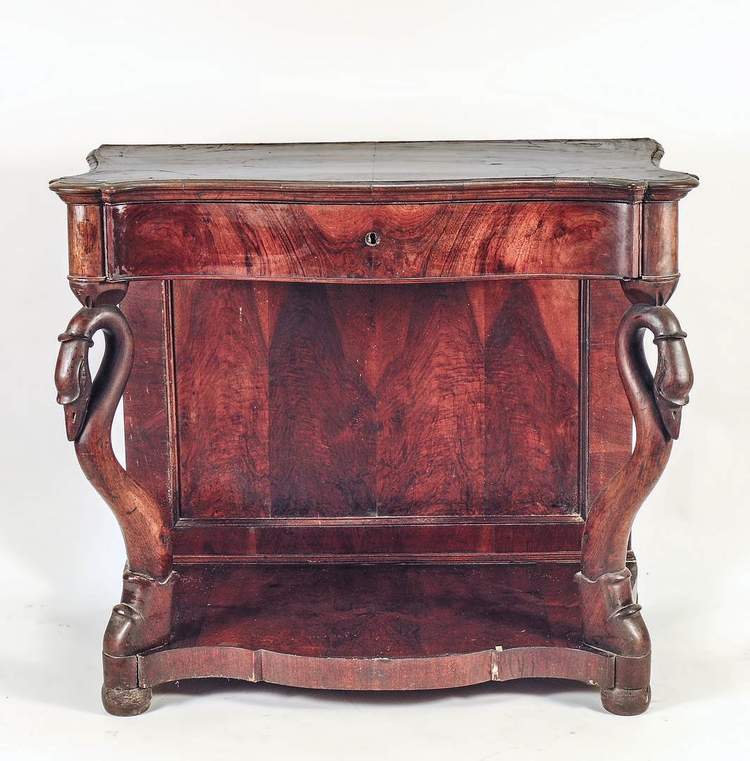 PICCOLA CONSOLE IMPIALLACCIATA IN PIUMA DI NOCE metà del XIX secolo piano sagomato, un cassetto nella fascia, sostegni anteriori a collo di cigno su pianetto mosso, difetti h cm 88x102x57