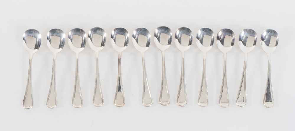 FRATELLI ZARAMELLA BRUNO E CESARE, Padova, dal 1968. Lotto composto da dodici cucchiaini da caffè in argento 800. Al retro recano punzoni: losanga locativa 30PD, stemma dell'argentiere e 800. Cm 12,5x3. Peso: 254 gr.