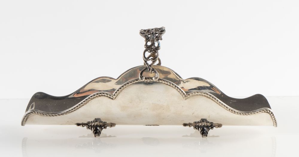 Alessandria, inizio del XX secolo. Portagrissini in argento 800. Sul bordo superiore reca punzoni: 800 in campo libero e losanga locativa alessandrina. Cm 12x28,5x7,5. Peso: 265 gr. (rotture)