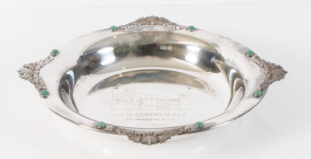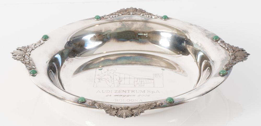 ARGENTERIA STEFANI, Bologna, XXI secolo. Piatto in argento 800 con centro inciso e recante quattro decorazioni a palmette e cabochon di pietre dure sul bordo. Sotto la base reca punzoni: 800, Stefani e losanga locativa 9BO. Cm 4,2x32,5. Peso: 461 gr.